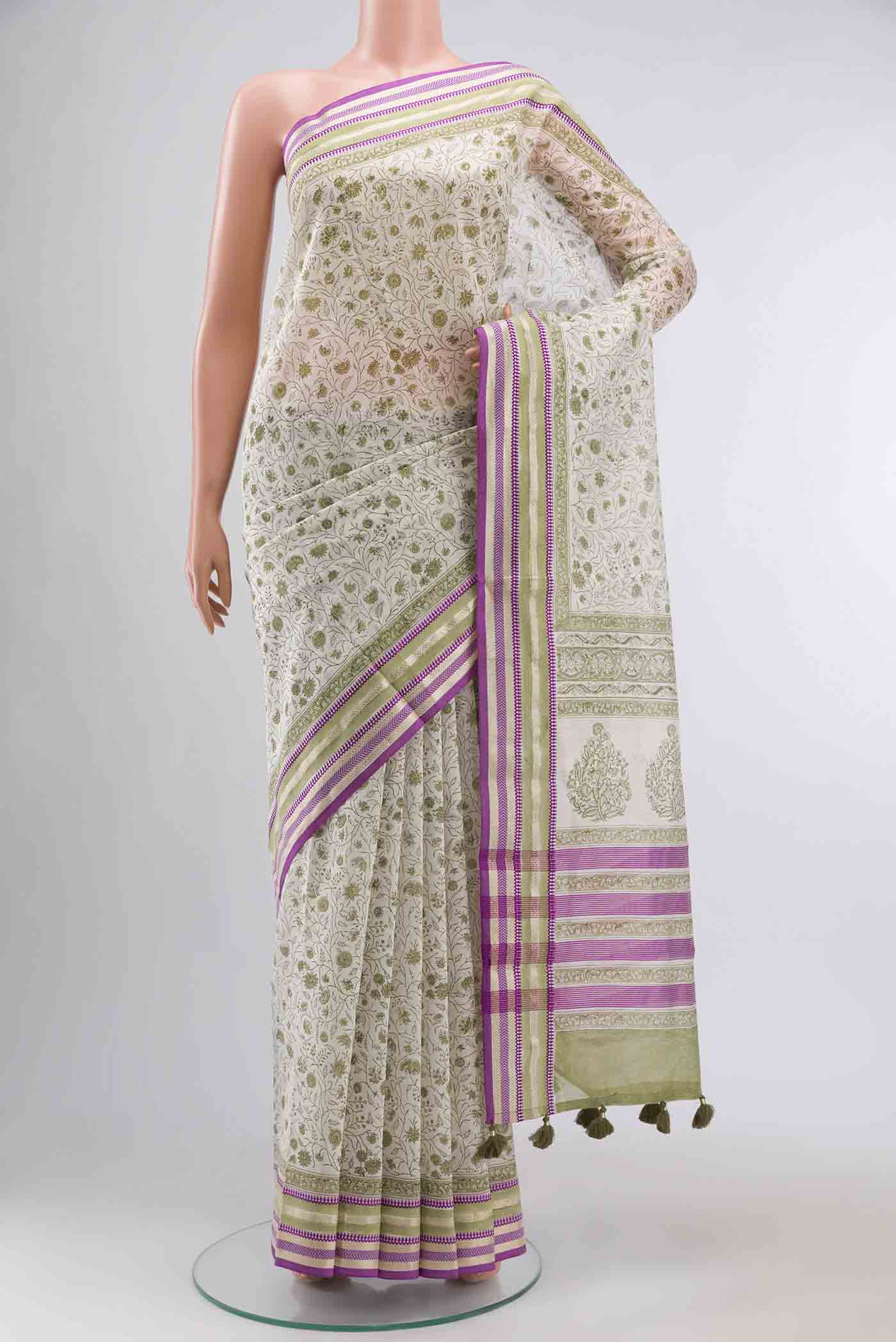 White Maheshwari Silk Cotton Saree